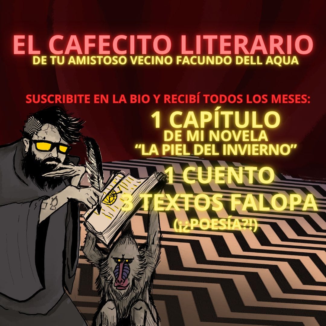Cómo les contaba antes: VOLVIÓ LA NECESIDAD DE TENER UN QUINTO TRABAJO así que estoy publicando cosas en cafecito (que también te llegan directo al mail) así que si quieren recibir un montón de obra mensual, se pueden suscribir acá, MIREN EL HORRIBLE FLYER QUE HICE. SUSCRIBITE ACÁ DIJE